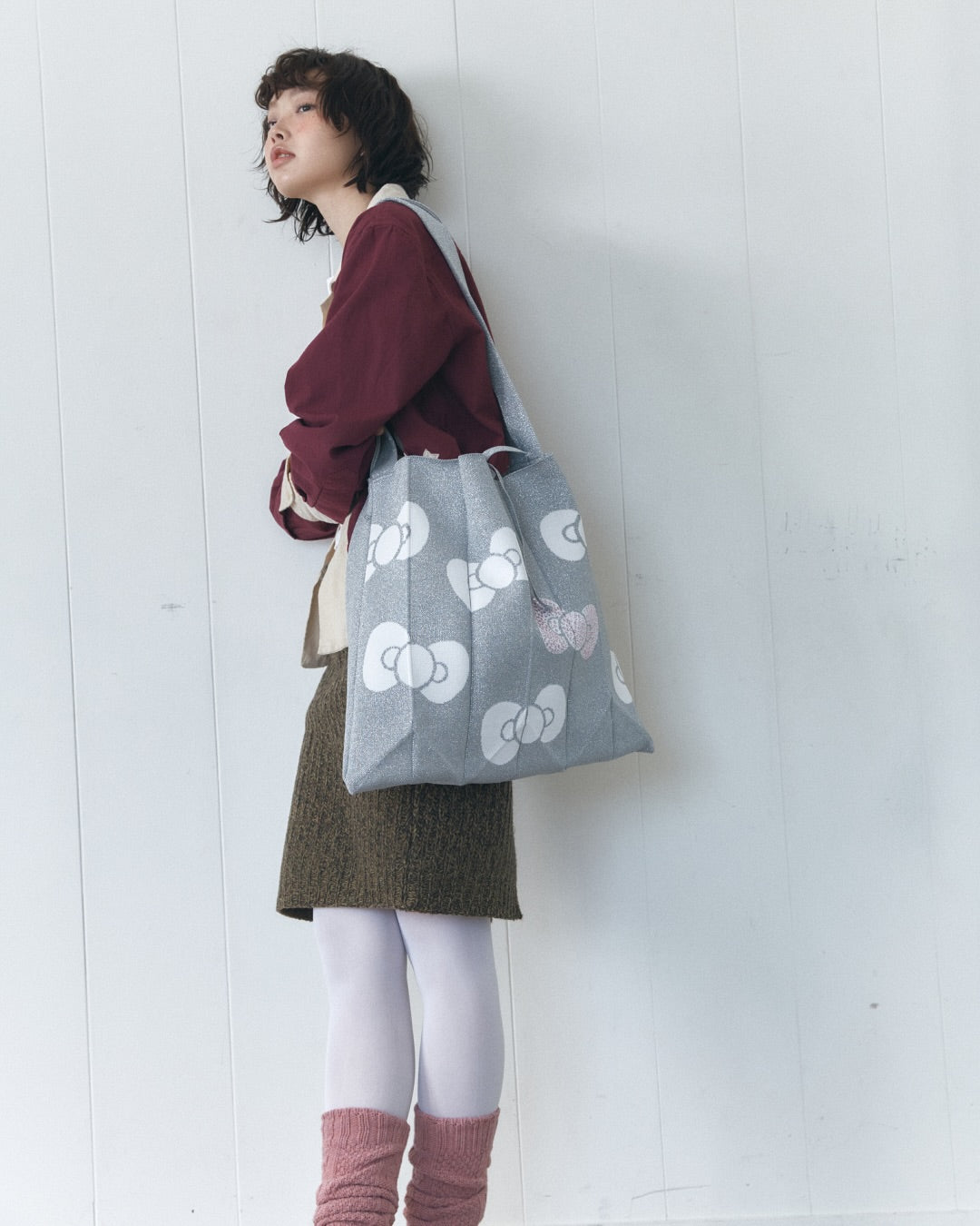 韓國 Joseph & Stacey X HELLO KITTY|Lucky Pleats Knit Cross big Hello Kitty Ribbon tote bag|Rich Black ♥ Platinum ♥ Gold