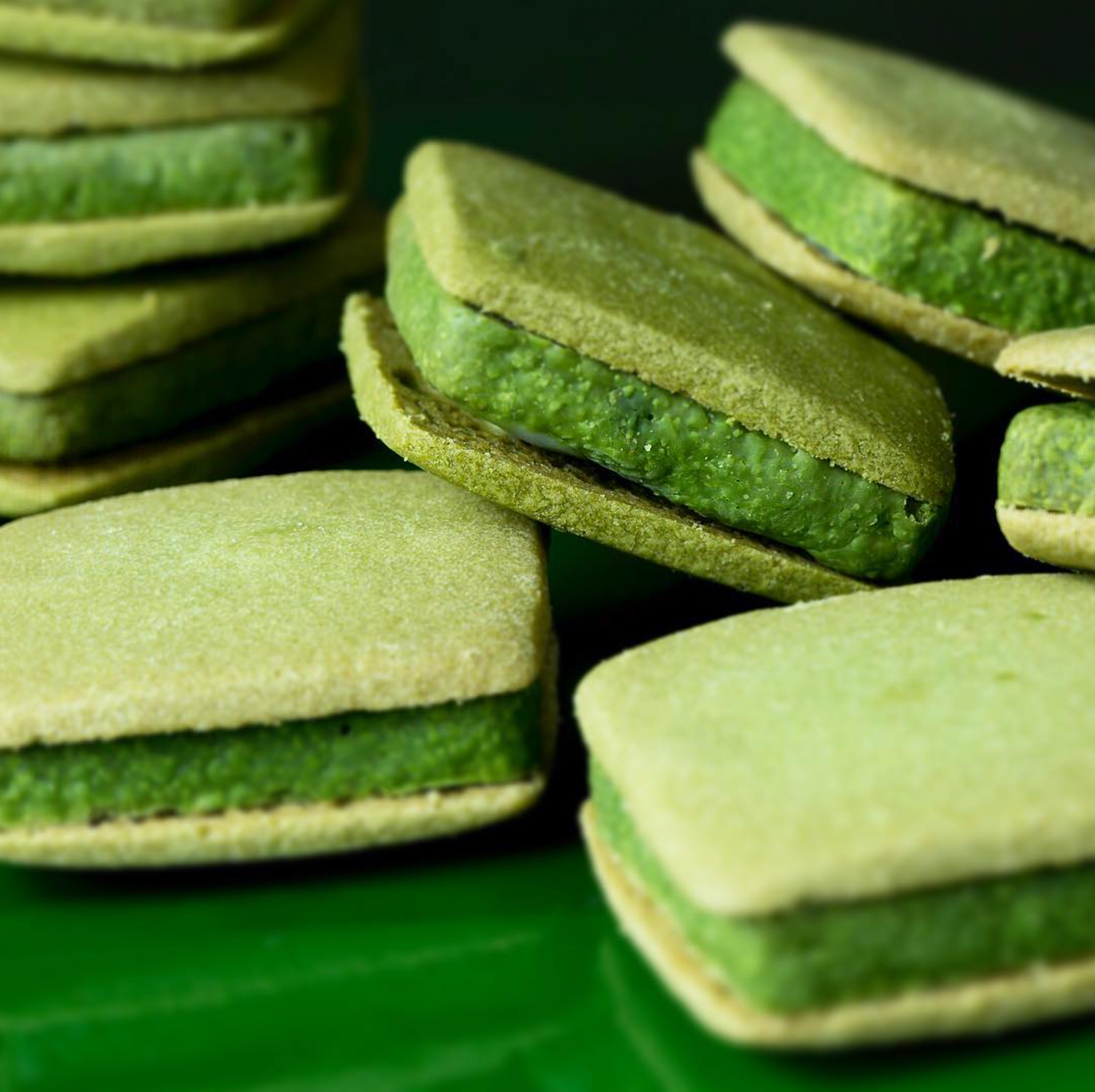 厚厚的抹茶朱古力夾在鬆脆的曲奇餅之間。芳香的茶味優雅地蔓延,餘韻順滑甘甜