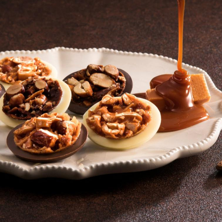 杏仁、腰果鬆脆輕盈的口感和焦糖的香氣與朱古力相遇。